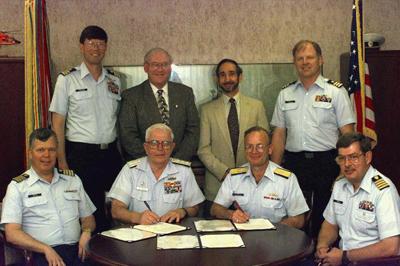 At 1300, June 12, 1997, the formal signing of a Memorandum of Understanding for Employment of the U.S. Coast Guard Auxiliary in support of the Coast Guard's National Recreational Boating Safety Program. Left to right Standing: CDR Ron Walters Asst Chief, Auxiliary Operations Division (G-OCX-2) Mr. John Malatak Chief, Program Development and Implementation Division (G-OPB-2) Mr. Al Marmo Chief, Program Management Division (G-OPB-1) CDR Tom Martin Chief, Auxiliary Operations Division (G-OCX-2) SITTING Left to Right CAPT Tony Stimatz Chief, Office of Boating Safety (G-OPB) COMO Ralph Oberlander, USCG Auxiliary NAVCO-RBS RADM James Hull, USCG Director of Operations Policy (G-OP) CAPT Al Summy Chief Director, Office of Auxiliary (G-OCX)